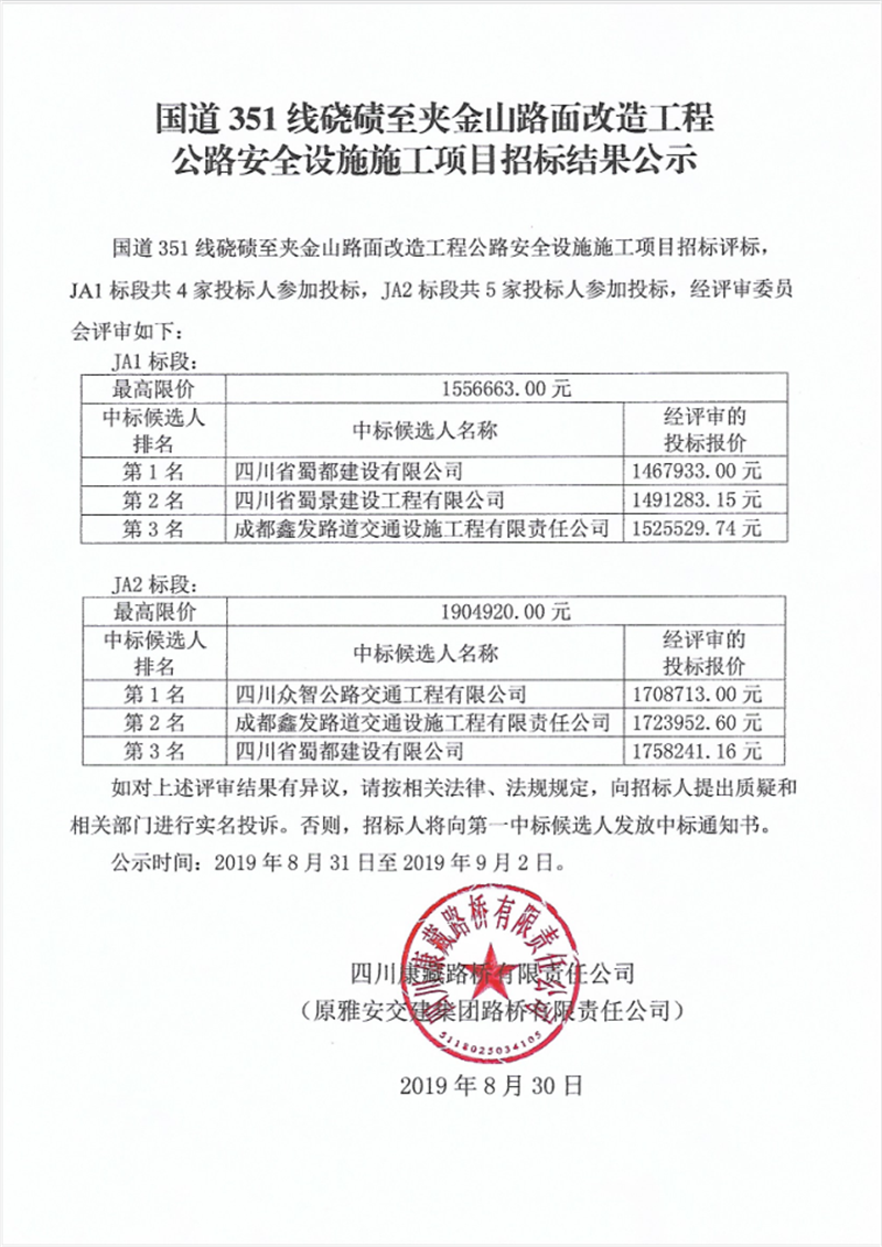 國道351線磽磧至夾金山路面改造工程公路安全設(shè)施施工項目招標(biāo)結(jié)果公示