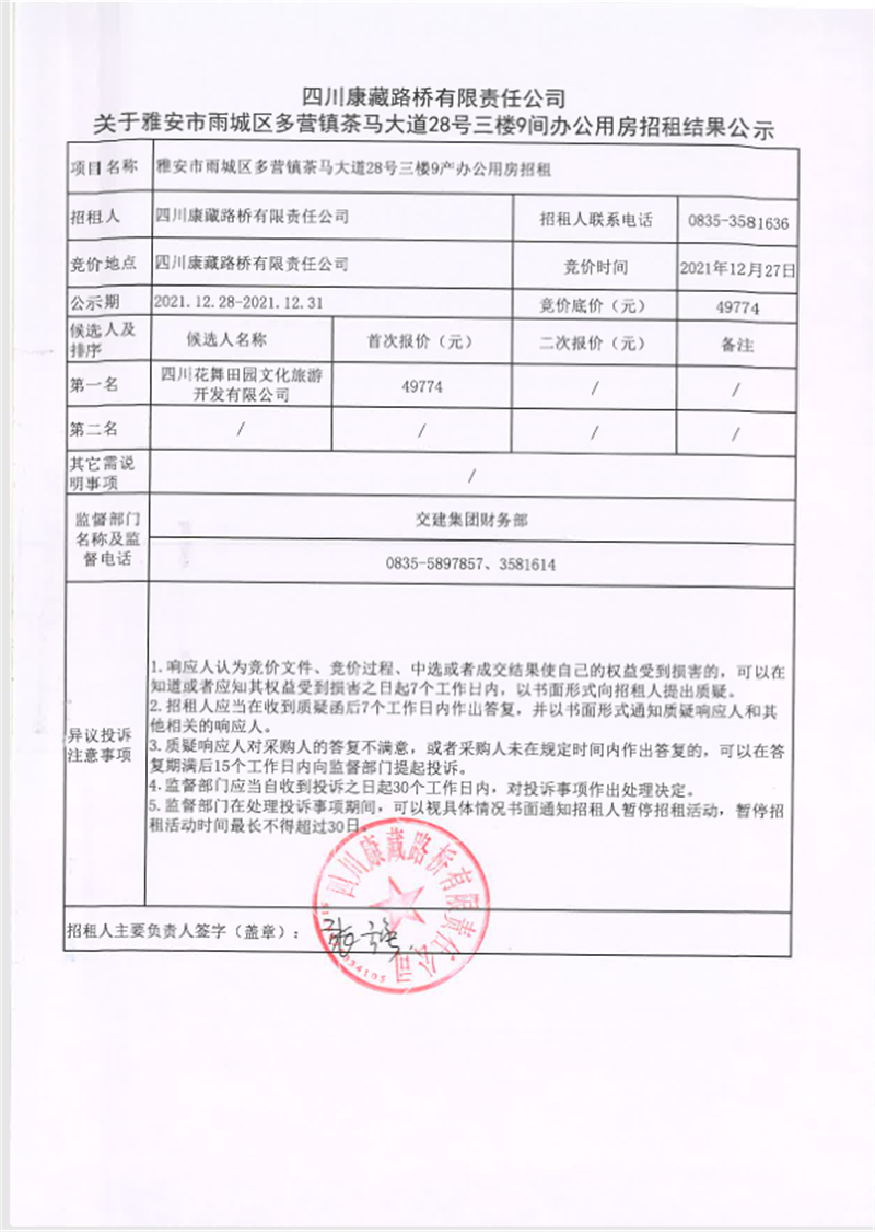 四川康藏路橋有限責(zé)任公司關(guān)于雅安市雨城區(qū)多營鎮(zhèn)茶馬大道28號三樓9間辦公用房招租結(jié)果的公示