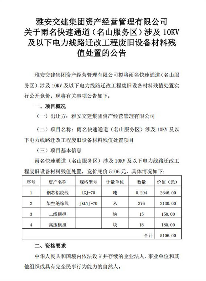 關(guān)于雨名快速通道(名山服務(wù)區(qū))涉及10KV及以下電力線路遷改工程廢舊設(shè)備材料殘值處置的公告