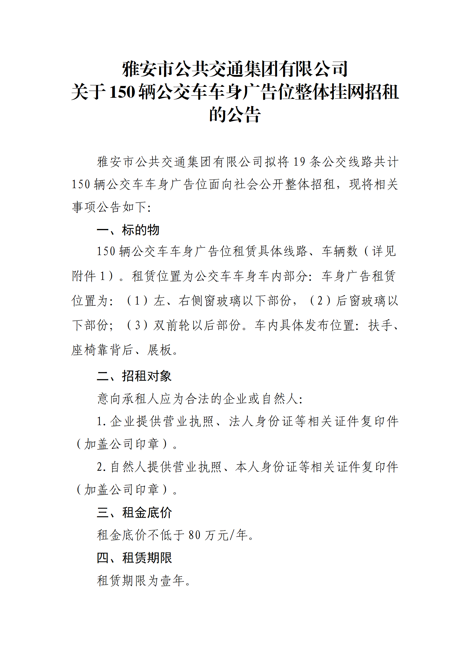雅安市公共交通集團(tuán)有限公司 關(guān)于150輛公交車(chē)車(chē)身廣告位整體掛網(wǎng)招租的公告
