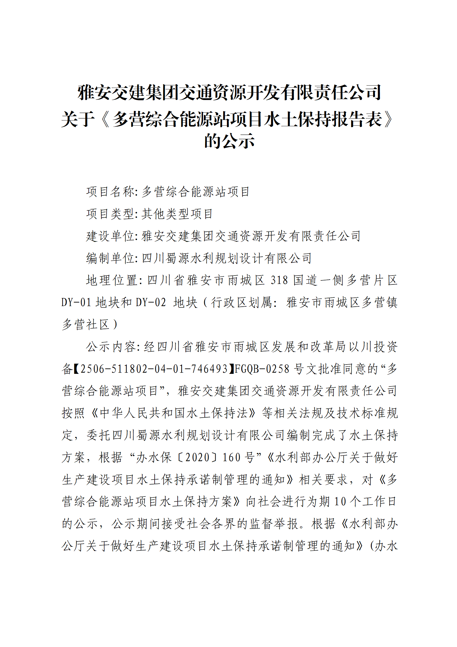 雅安交建集團(tuán)交通資源開發(fā)有限責(zé)任公司 關(guān)于《多營綜合能源站項(xiàng)目水土保持報(bào)告表》的公示