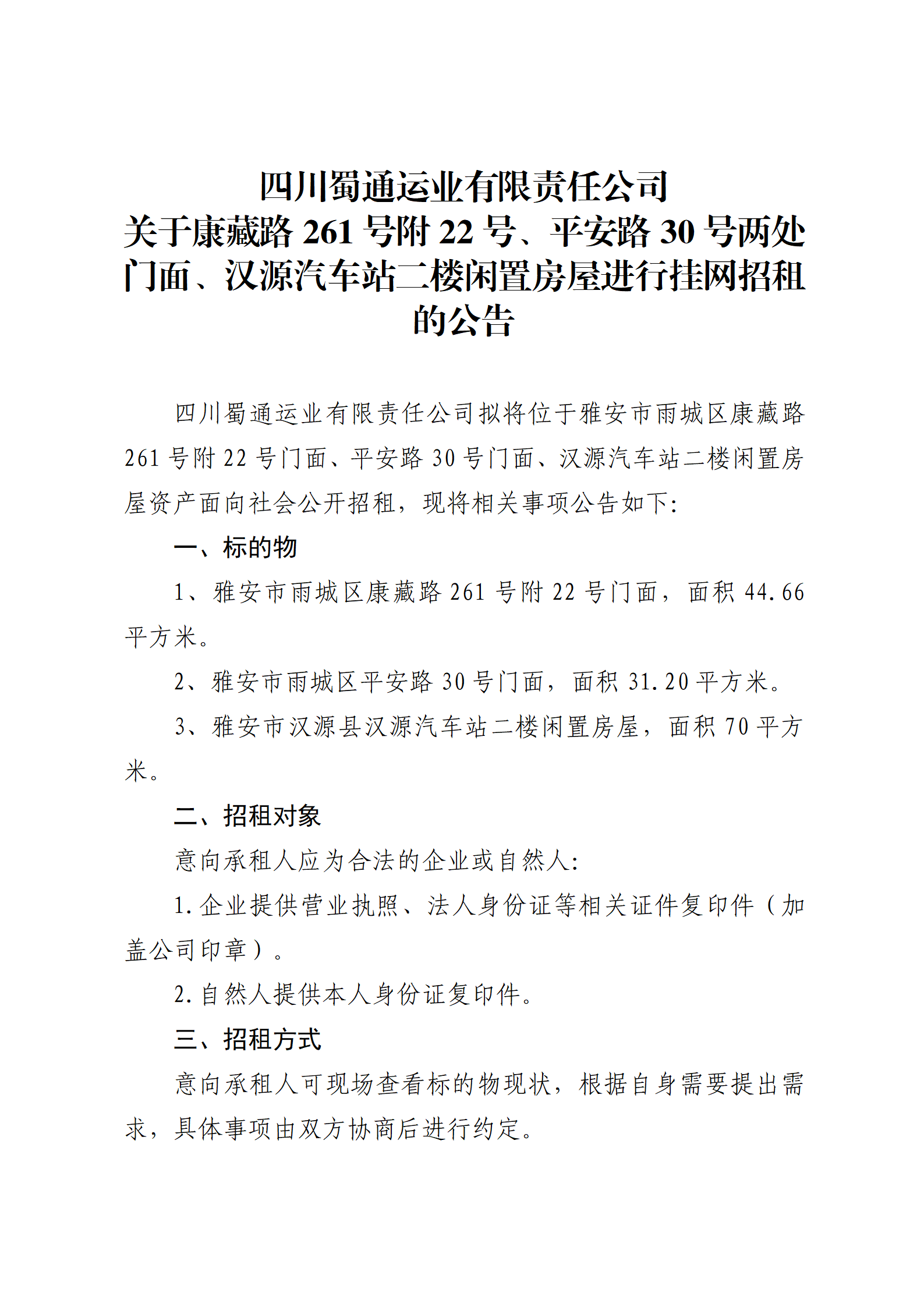 四川蜀通運(yùn)業(yè)有限責(zé)任公司 關(guān)于康藏路261號(hào)附22號(hào)、平安路30號(hào)兩處門面、漢源汽車站二樓閑置房屋進(jìn)行掛網(wǎng)招租的公告
