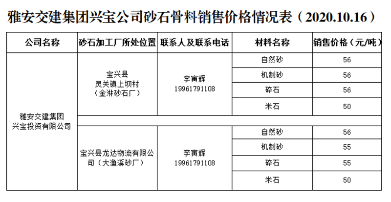 雅安交建集團(tuán)興寶公司砂石骨料銷售價(jià)格情況表(2020.10.16)