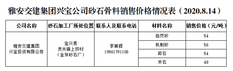 雅安交建集團(tuán)興寶公司砂石骨料銷售價格情況表(2020.8.14)