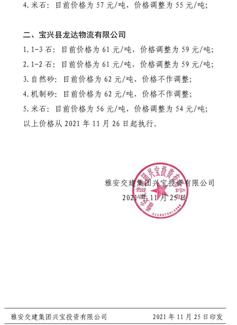 雅安交建集團興寶公司關于調整成品料銷售價格的通知(2021.11.26)