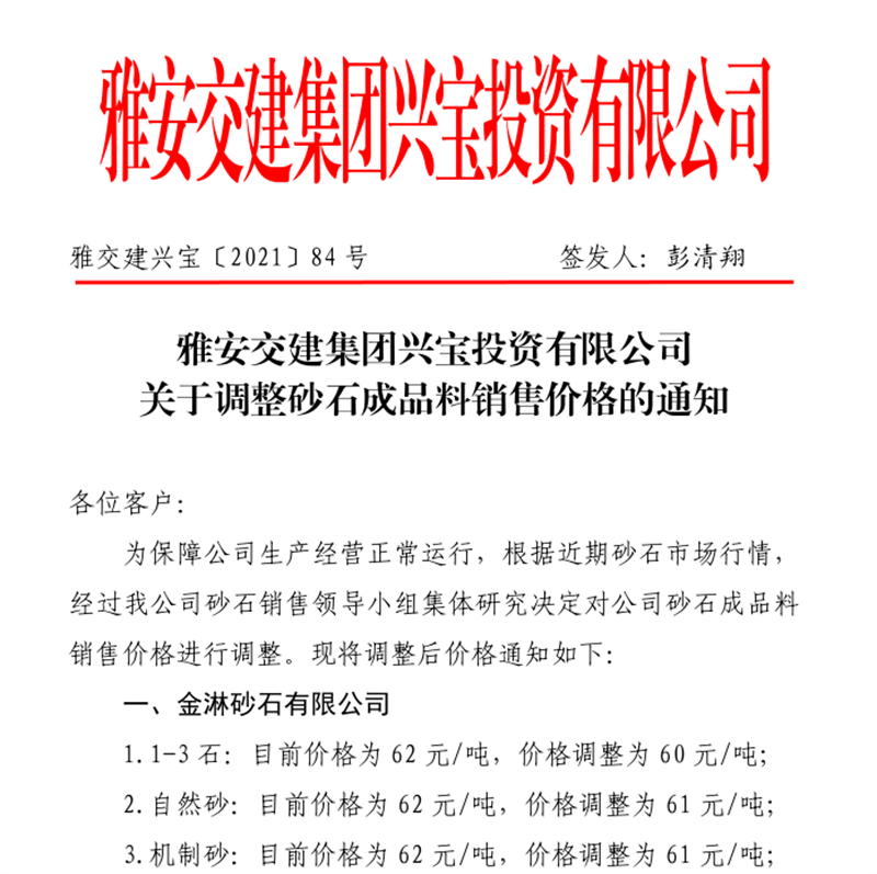 雅安交建集團丹石公司關于調整砂石成品骨料銷售價格的通知(2021.12.9)