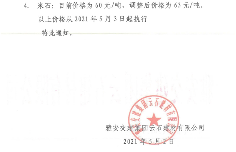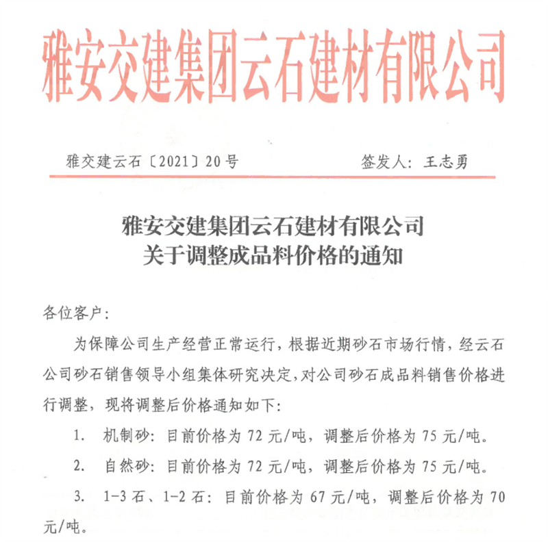 雅安交建集團云石公司砂石骨料銷售價格情況表(2021.5.3)