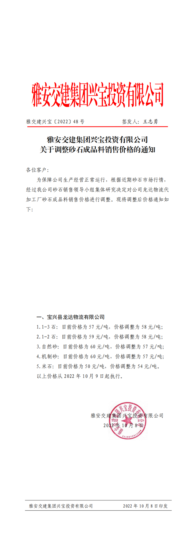 雅交建興寶〔2022〕48號 關于調(diào)整砂石成品料銷售價格的通知10.8