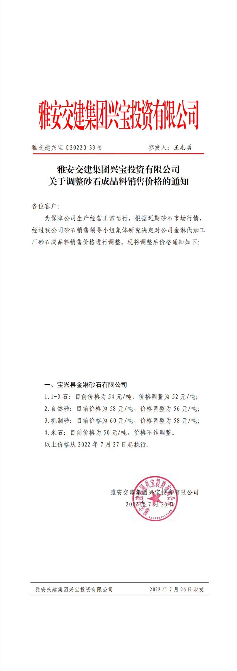 雅交建興寶〔2022〕33號(hào) 關(guān)于調(diào)整砂石成品料銷售價(jià)格的通知--7.27