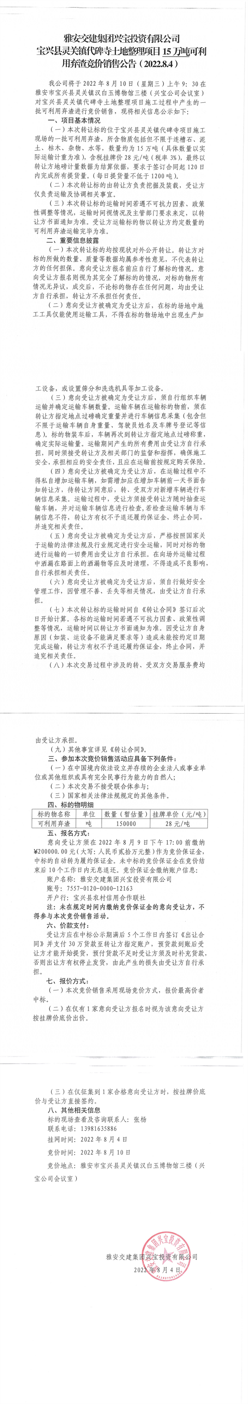 雅安交建集團(tuán)興寶投資有限公司靈關(guān)鎮(zhèn)代碑寺土地整理項目15萬噸可利用棄渣競價銷售公告(2022.8.4)