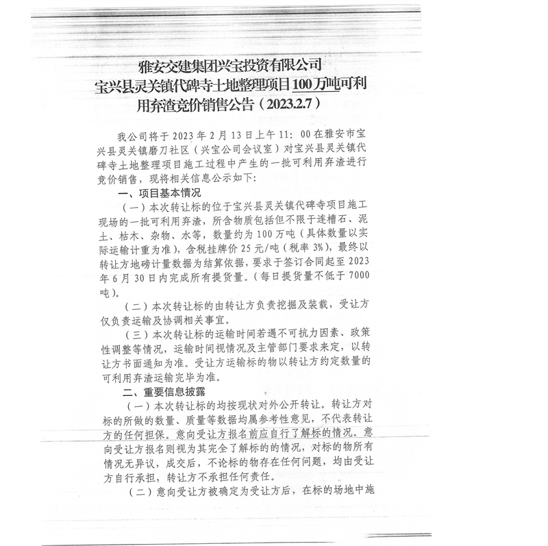 雅安交建集團興寶投資有限公司靈關鎮(zhèn)代碑寺土地整理項目100萬噸可利用棄渣競價銷售公告(2023.2.7)