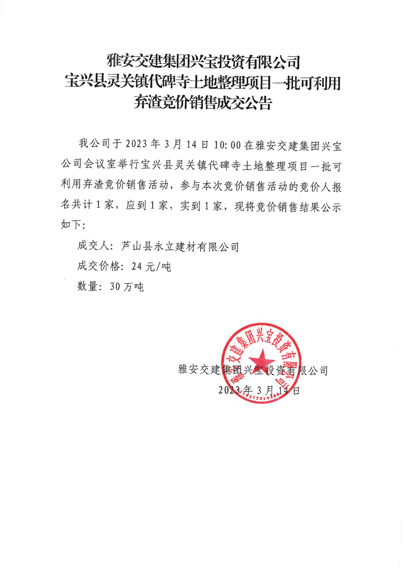 雅安交建集團(tuán)興寶投資有限公司靈關(guān)鎮(zhèn)代碑寺土地整理項(xiàng)目30萬(wàn)噸可利用棄渣競(jìng)價(jià)銷售成交公告(2023.3.20)