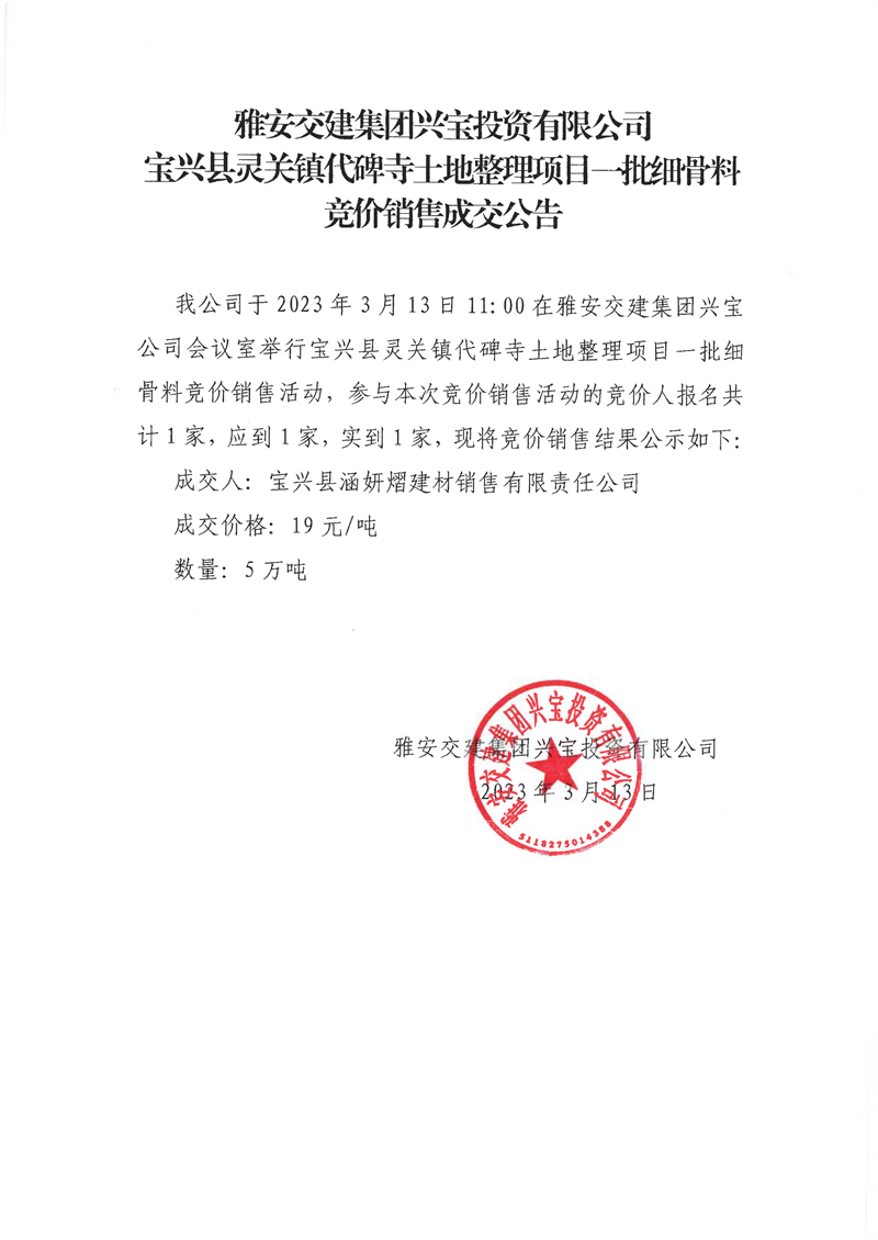 雅安交建集團(tuán)興寶投資有限公司30萬(wàn)噸可利用棄渣競(jìng)價(jià)銷售成交公告、5萬(wàn)噸細(xì)骨料竟價(jià)成效公告(2023.3.14)