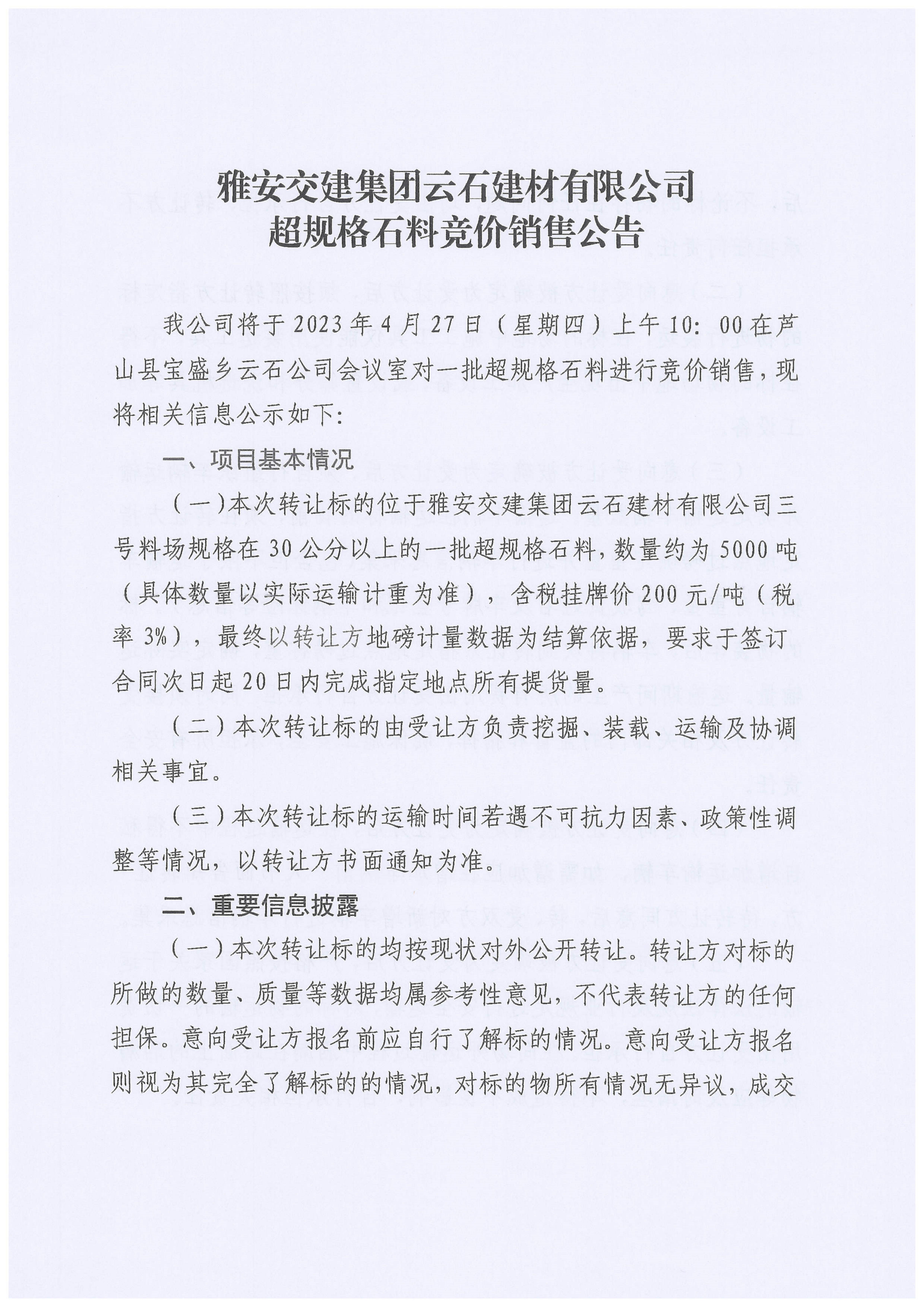 雅交建云石建材有限公司超規(guī)格石料競價(jià)銷售公告(2023-4-24)