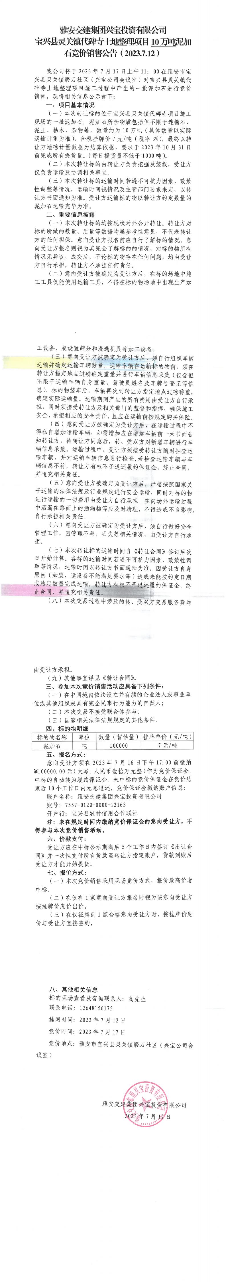 雅安交建集團(tuán)興寶投資有限公司寶興縣靈關(guān)鎮(zhèn)代碑寺土地整理項(xiàng)目10萬噸泥加石競價銷售公告(2023.7.12)