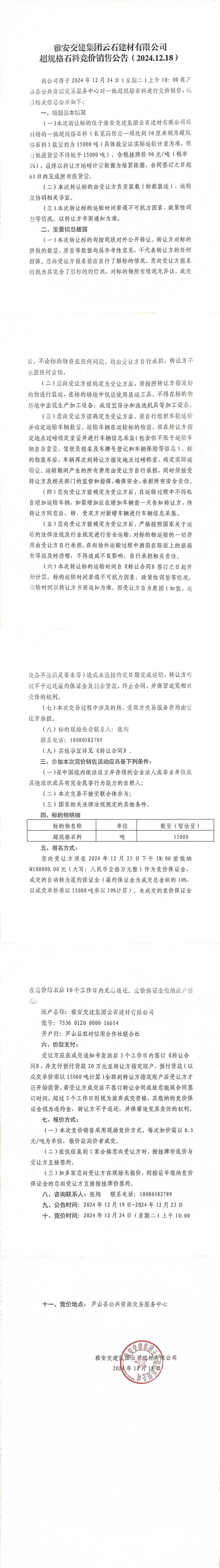 ÑŰ²½»½¨¼¯ˆF(tu¨¢n)ÔÆÊ¯½¨²ÄÓÐÏÞ¹«Ë¾³¬ÒŽ(gu¨©)¸ñʯƷÁϸ‚ƒr(ji¨¤)äNÊÛ¹«¸æ£¨2024-12-19£©