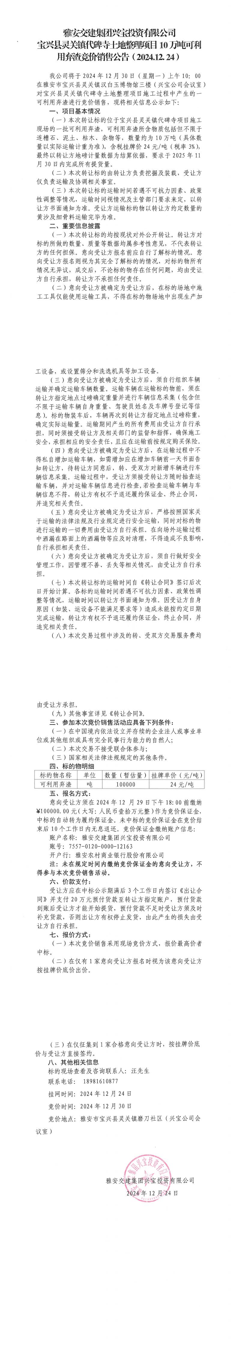 雅安交建集團(tuán)興寶投資有限公司靈關(guān)鎮(zhèn)代碑寺土地整理項(xiàng)目10萬(wàn)噸可利用棄渣競(jìng)價(jià)銷(xiāo)售公告(2024.12.24)