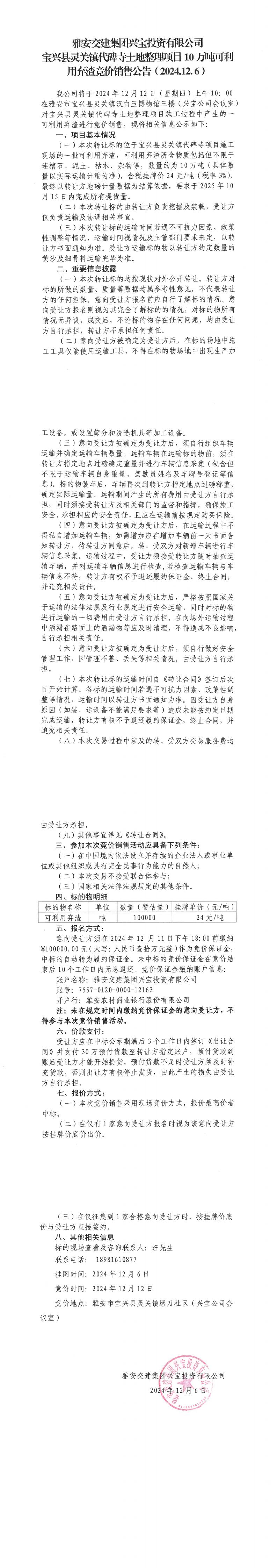 雅安交建集團(tuán)興寶投資有限公司靈關(guān)鎮(zhèn)代碑寺土地整理項(xiàng)目10萬噸可利用棄渣競價(jià)銷售公告(2024.12.06)