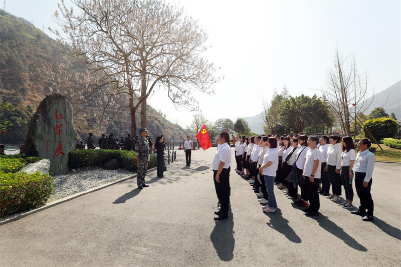 隨后,全體黨員干部在紅軍強渡大渡河紀念碑前深切緬懷革命先烈,并向中國工農(nóng)紅軍強渡大渡河紀念碑敬獻花籃,重溫入黨誓詞。“我志愿加入中國共產(chǎn)黨……永不叛黨!比w黨員干部在紀念碑前,面對黨旗莊嚴宣誓,字字鏗鏘,句句入耳,入黨時的拳拳初心再一次重重敲擊黨員同志們的心靈,大家的黨性再一次得到錘煉。