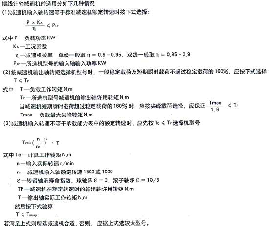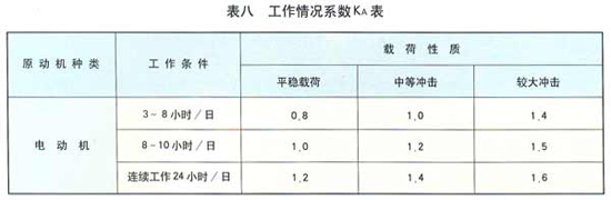 本系列擺線針輪減速機是在每日八小時單向連續(xù)運轉(zhuǎn),載荷平穩(wěn)的條件下設(shè)計的,當(dāng)減速機實際工作時間和載荷性質(zhì)與上述設(shè)計條件不符時,應(yīng)以工作情況系數(shù)KA進行修正,KA值按表八確定。