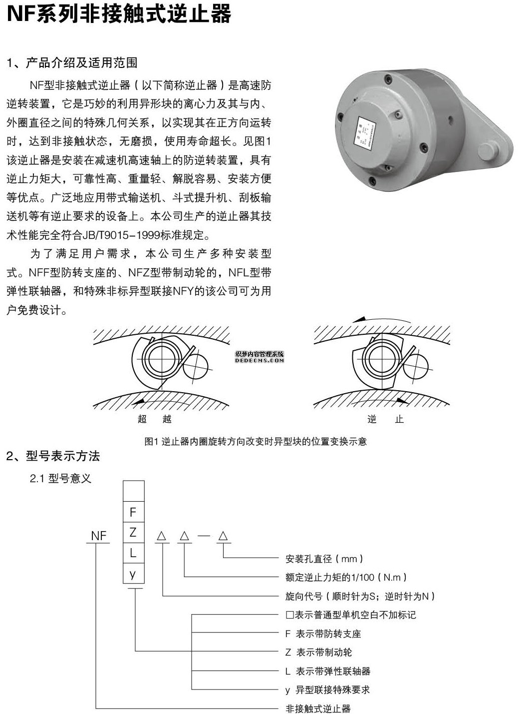 NF型非接觸式逆止器(以下簡稱逆止器)是高速防逆轉(zhuǎn)裝置,它是巧妙的利用異形塊的離心力及其與內(nèi)、外圈直徑之間的特殊幾何關(guān)系,以實現(xiàn)其在正方向運(yùn)轉(zhuǎn)時,達(dá)到非接觸狀態(tài),無磨損,使用壽命超長。