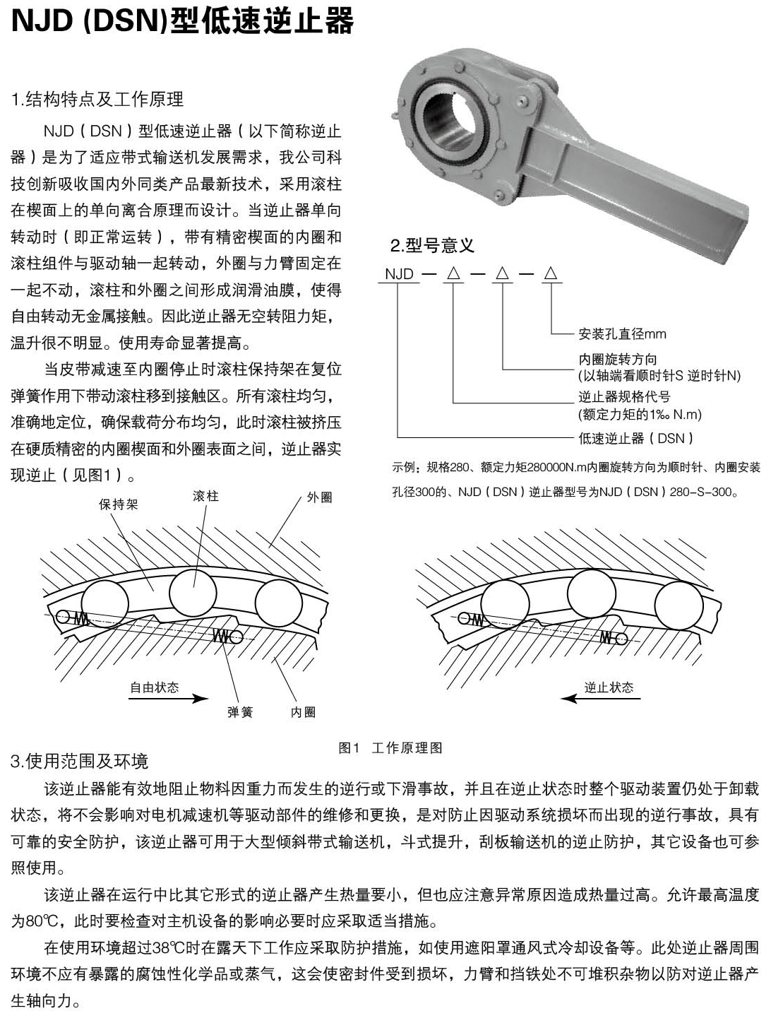 NJD(DSN)型低速逆止器(以下簡稱逆止器)是為了適應帶式輸送機發(fā)展需求,眾誠公司科技創(chuàng)新吸收國內(nèi)外同類產(chǎn)品最新技術(shù),采用滾柱在楔面上的單向離合原理而設(shè)計。當逆止器單向轉(zhuǎn)動時(即正常運轉(zhuǎn)),帶有精密楔面的內(nèi)圈和滾柱組件與驅(qū)動軸一起轉(zhuǎn)動,外圈與力臂固定在一起不動,滾柱和外圈之間形成潤滑油膜,使得自由轉(zhuǎn)動無金屬接觸。因此逆止器無空轉(zhuǎn)阻力矩,溫升很不明顯。使用壽命顯著提高。
